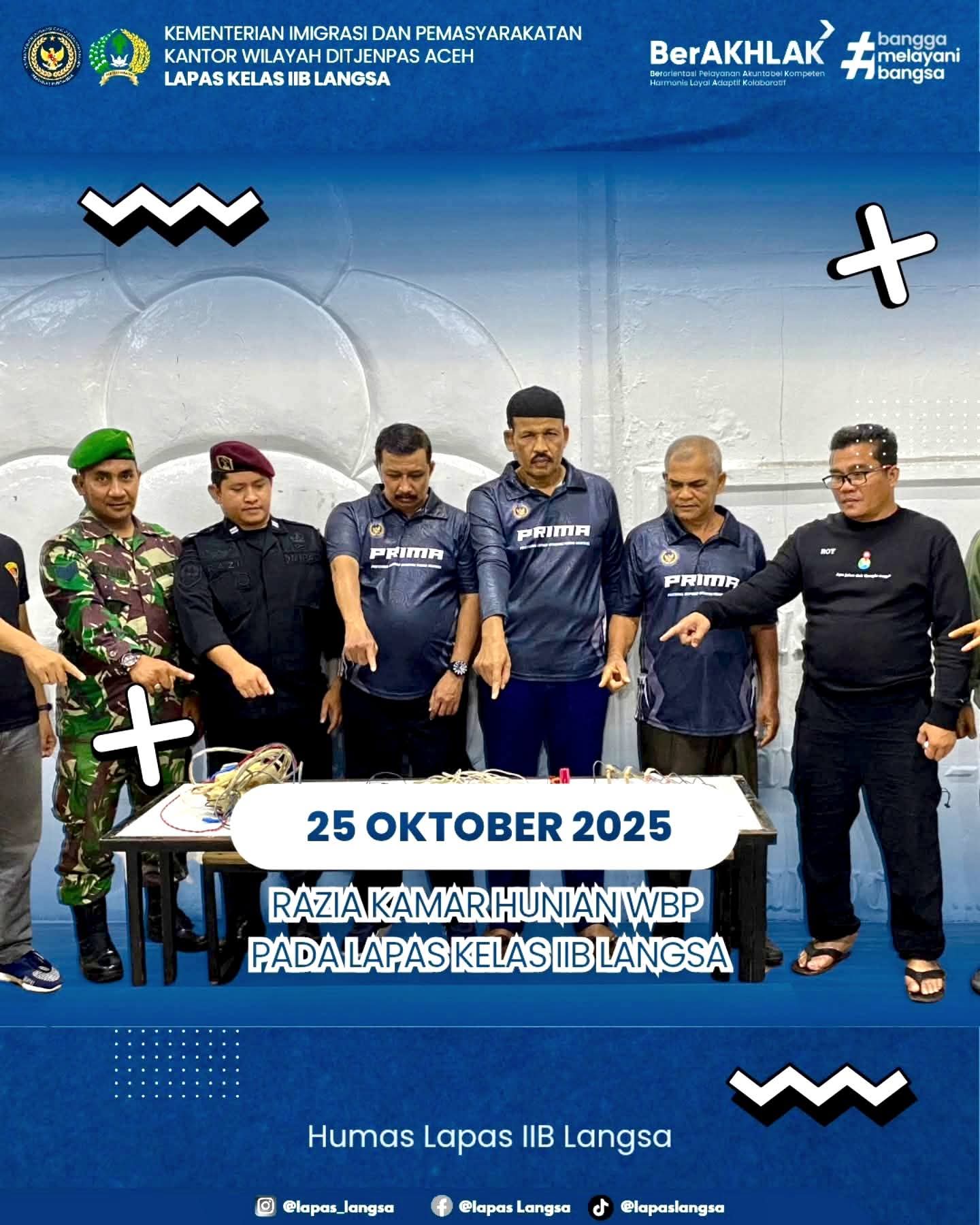 KOTA LANGSA Transparansi – Dalam rangka menindaklanjuti perintah Direktur Jenderal Pemasyarakatan Kementerian Hukum dan Hak Asasi Manusia Republik Indonesia, Lembaga Pemasyarakatan (Lapas) Kelas IIB Langsa melaksanakan kegiatan razia serentak di kamar hunian warga binaan pemasyarakatan (WBP) pada Sabtu malam, 25 Oktober 2025.