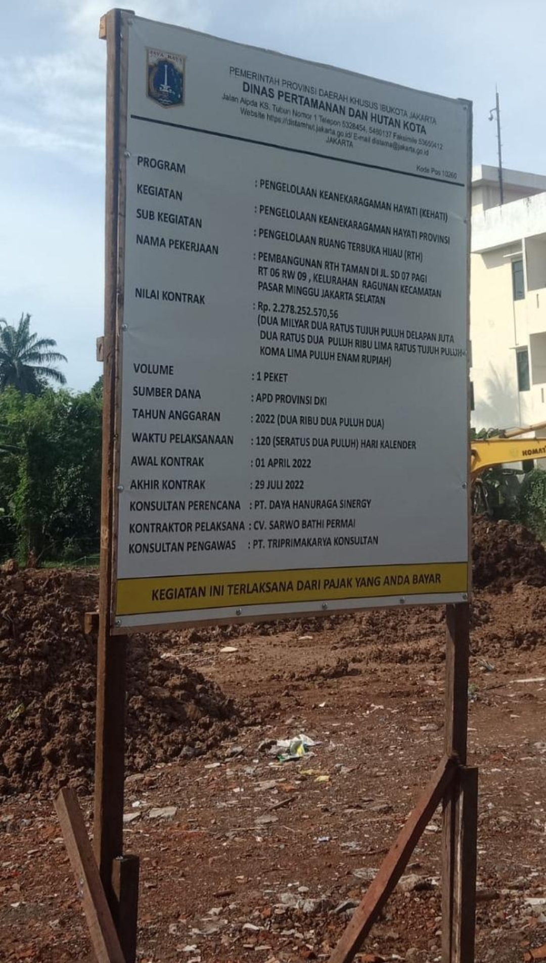 JAKARTA, mediatransparancy.com – Gubernur DKI Jakarta, Salah seorang pemungut sampah yang melintas di Jalan SD 07 Pagi, Kelurahan Ragunan, Kecamatan Pasar Minggu, Kota Administrasi Jakarta Selatan merasa sedikit bingung ketika tanpa sengaja melihat papan proyek pelaksanaan kegiatan Pembangunan RTH Taman di Jalan SD 07 Pagi RT 06/09.