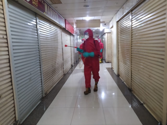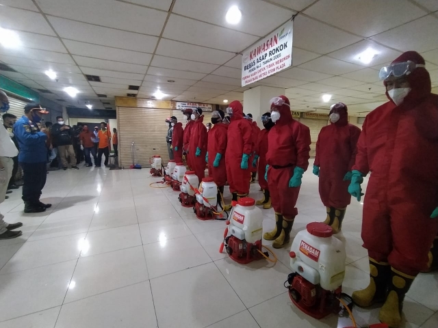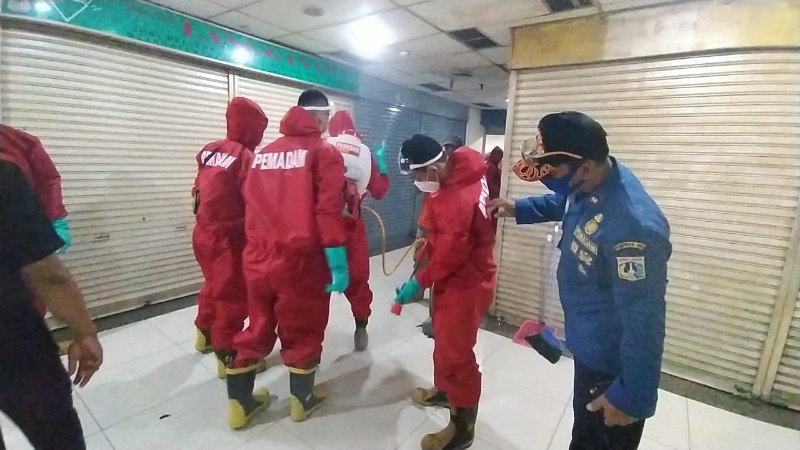 Sementara penyemprotan di Pertokoan Pasar Baru di pimpin Kepala Suku Dinas Penanggulangan Kebakaran dan Penyelamatan Jakarta Pusat, Asril Rizal, bersama Instansi Perhubungan, TNI, Polri, Pol PP dan instansi terkait lainnya.