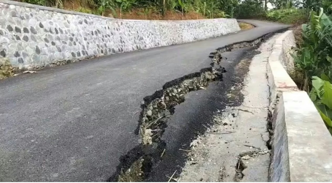 Di Kampung Cibeureum, Desa Buana Jaya, badan jalan terlihat amblas dan dipenuhi retakan. Kondisi serupa juga terjadi di Desa Antajaya, dengan permukaan jalan mulai berlubang dan retak.