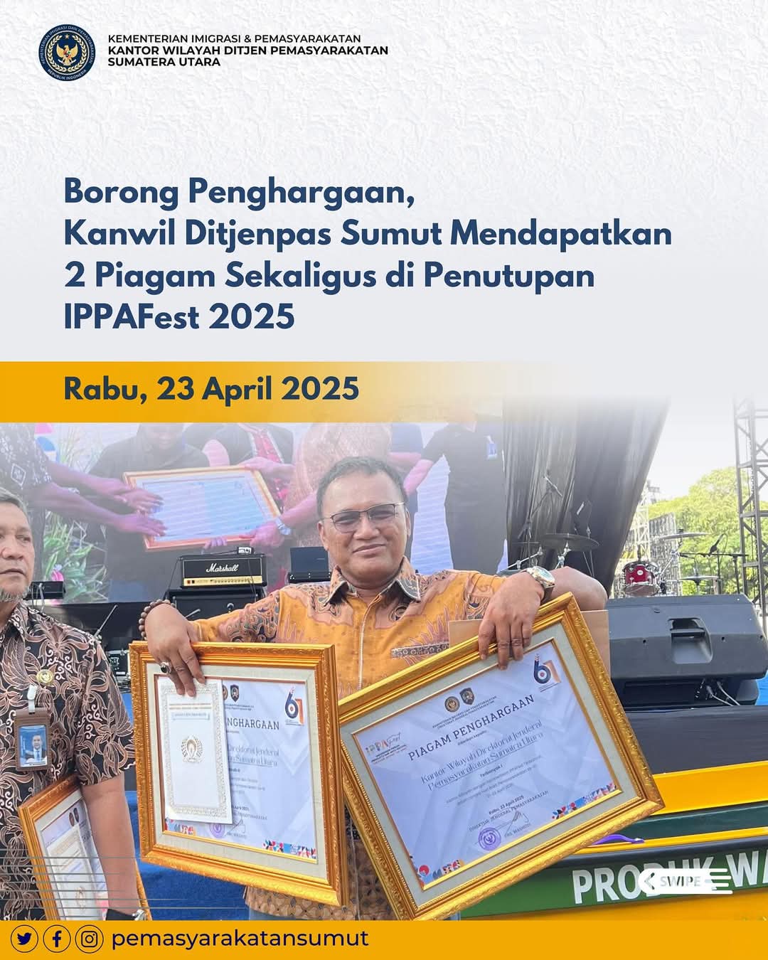 Dalam pengumuman tersebut, Kantor Wilayah Direktorat Jenderal Pemasyarakatan (Kanwil Ditjenpas) Sumatera Utara mencetak prestasi membanggakan dengan meraih dua penghargaan Nasional: