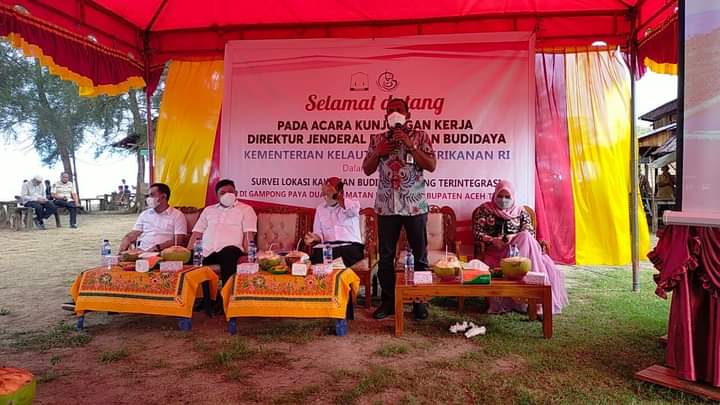 MEDIA TRANSPARANCY ACEH TIMUR – Direktur Jenderal Perikanan Budidaya, Kementerian Kelautan dan Perikanan Dr. TB. Haeru Rahayu, A.Pi., M.Sc mengunjungi lokasi sekaligus menggelar pertemuan dengan pemilik lahan yang akan dijadikan kawasan budidaya udang terintegrasi di Aceh Timur, Jumat (1/10/2021).