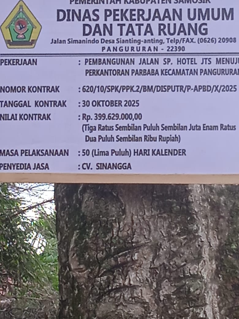 SAMOSIR, MediaTransparancy.com | Pada tahun anggaran 2025 ini, Pemerintah Kabupaten (Pemkab) Samosir melalui Dinas Pekerjaan Umum dan Tata Ruang (Dinas PUTR Samosir, mengalokasikan anggaran sebesar Rp 399.629.000 untuk melaksanakan kegiatan Pembangunan Jalan SP. Hotel JTS Menuju Perkantoran Parbaba Kecamatan Pangururan dengan No Kontak: 620/10/SPK/PPK.2/BM/DISPUTR/P-APBD/X/2025 tertanggal 30 Oktober 2025, yang dikerjakan CV Sinangga dengan waktu pelaksanaan lima puluh hari kalender.