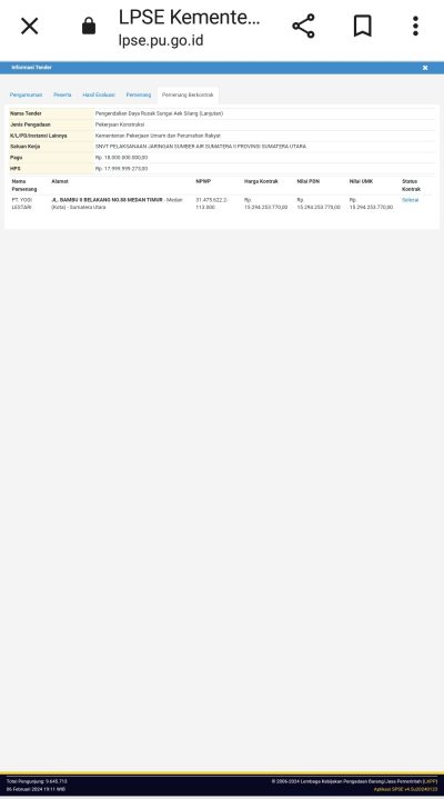 SUMUT, MediaTranparancy.com – Pada tahun anggaran 2023 lalu, Kementerian PUPR Republik Indonesia menggelontorkan anggaran sebesar Rp 15.294.254.803,60 untuk pelaksanaan kegiatan Pengendalian Daya Rusak Sungai Aek Silang (lanjutan) yang dikerjakan oleh PT Yogi Lestari, dengan konsultan PT Ika Adya Perkasa.