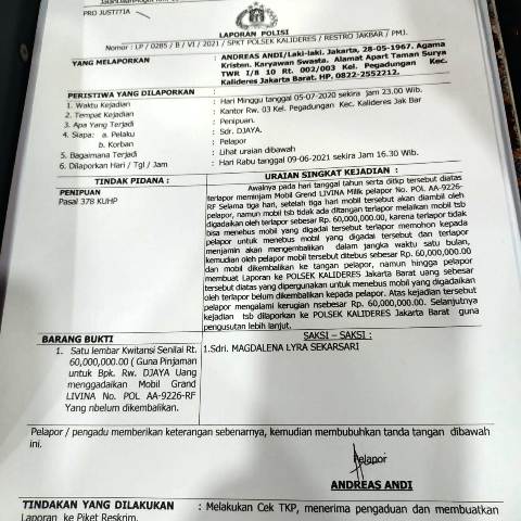 Terlapor yang merupakan ketua RW pelapor itu, meminta kepada pemilik mobil pelapor supaya menebus mobilnya dulu dan dalam waktu dekat terlapor akan mengembalikan uang pelapor, warga Apartemen Taman Surya Pegadungan itu. Namun tunggu dan ditunggu uang pelapor tidak dikembalikan hingga laporan masuk ke Polsek Kalideres.