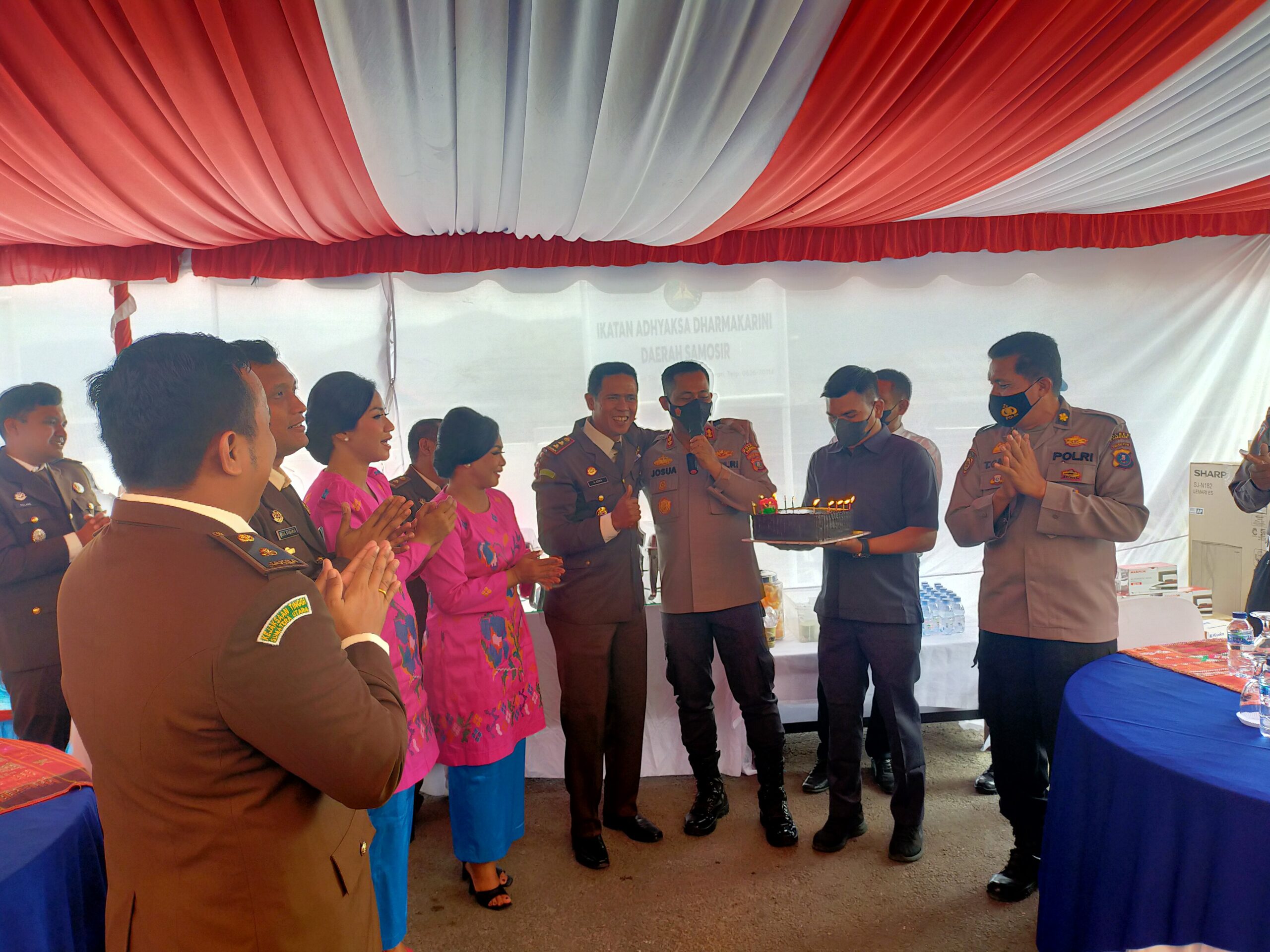 Sekira pukul 11:50 Wib, Kapolres Samosir AKBP Josua Tampubolon bersama jajaranya membuat kejutan. Josua Tampubolon berjalan dari gerbang pintu masuk Kejari Samosir dengan membawa kue ulang tahun yang disusun lilin yang sudah menyala, dan langsung disambut Kajari Samosir.