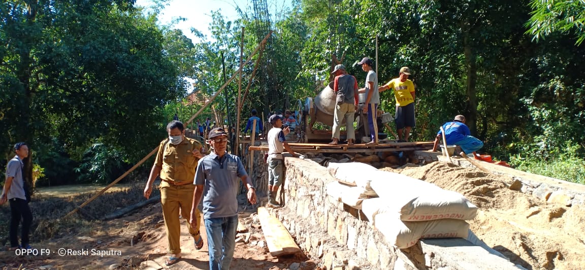 LAMPUNG UTARA | MEDIA TRANSPARANCY – Guna meningkatkan perekonomian masyarakat, Kepala Desa (Kades) Gilih Suka Negeri, Kecamatan Abung Selatan, Kabupaten Lampung Utara (Lampura) ME. Lucky Yasin, SE., bersama warga melaksanakan Padat Karya Nyata (PKT) pembangunan jembatan gantung berlantai plat besi di Way Pengubuan di desa setempat, Senin (11/05/2020).
