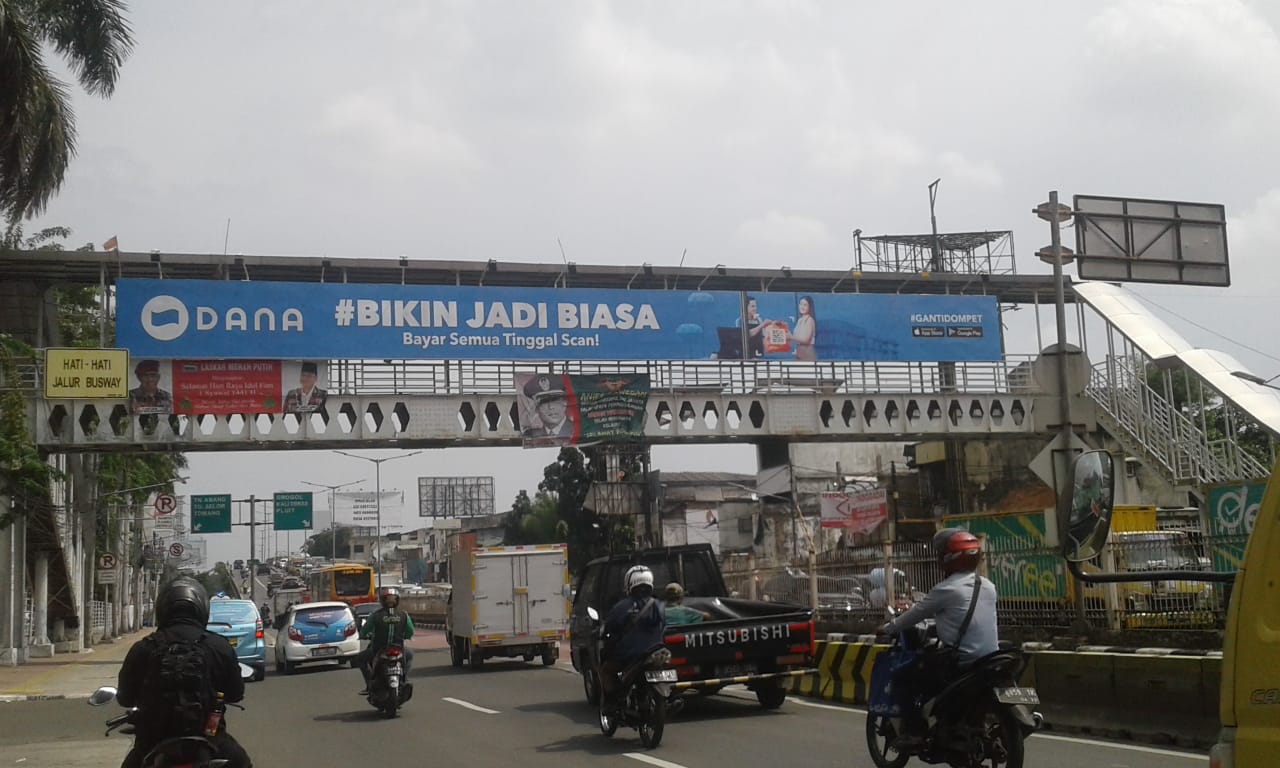 Reklame tersebut terdapat di JPO jalan Hasyim Ashari, dekat Play Over Roxi, Kelurahan Cideng dan Kelurahan Duri Pulo, Kecamatan Gambir Jakarta Pusat. Reklame bertuliskan “Dana # Bikin Jadi Biasa, Bayar Semua Tinggal Scan” itu, diduga tidak memiliki ijin dari Pemerintah Provinsi DKI Jakarta.