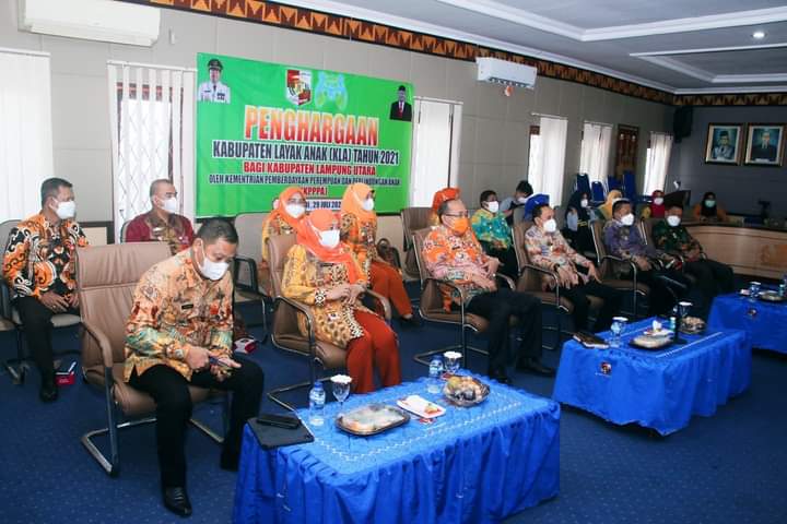 LAMPUNG UTARA | MEDIA TRANSPARANCY – Kabupaten Lampung Utara (Lampura) meraih penghargaan Kabupaten/Kota Layak Anak (KLA) Peringkat Pratama. Prestasi ini diraih pada acara Penghargaan Kabupaten/Kota Layak Anak (KLA) Tahun 2021 yang digelar secara Virtual Zoom dari Ruang Siger Setdakab Lampung Utara, Kamis (29/07/2021).