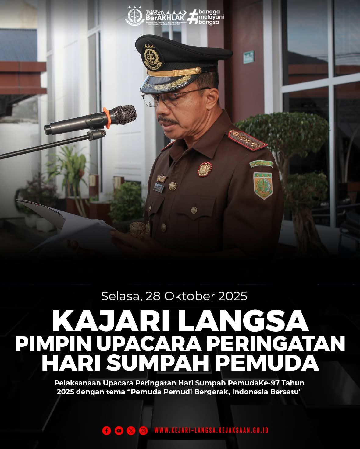 KOTA LANGSA Transparansi – Kepala Kejaksaan Negeri Langsa, Efrianto, S.H., M.H., bertindak sebagai Inspektur Upacara Peringatan Hari Sumpah Pemuda Ke-97 Tahun 2025 dengan tema “Pemuda Pemudi Bergerak Indonesia Bersatu” yang bertempat di halaman Kantor Kejaksaan Negeri Langsa Jl.T. Chick Ditunong, Gampong Jawa, Kecamatan Langsa Kota, Kota Langsa, Selasa, 28 Oktober 2025.
