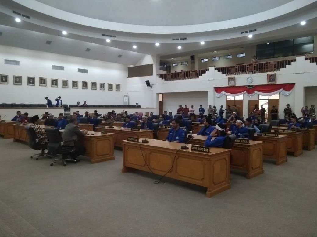 Beberapa Perwakilan mahasiswa (AMPI) saat diterima Ketua DPRD Kabupaten Bekasi, Sunandar, SE untuk beraudensi terkait 4 (empat) tuntutan mahasiswa dalam aksi damai yang digelar di plaza kantor Pemkab Bekasi pada, Jum’at (21/9) pagi.