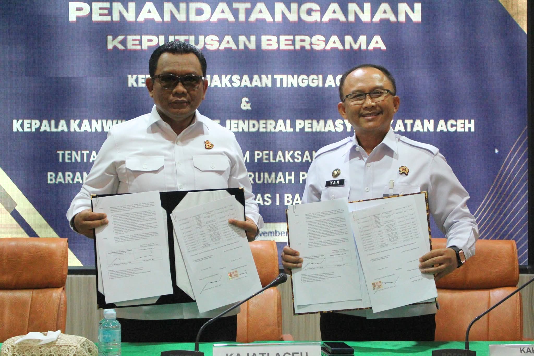 BANDA ACEH TRANSPARANSI – Dalam rangka memperkuat sinergi antar instansi dalam pengelolaan Barang Milik Negara (BMN), Kepala Kejaksaan Tinggi Aceh bersama Kepala Kantor Wilayah Direktorat Jenderal Pemasyarakatan (Ditjenpas) Aceh secara resmi menandatangani Keputusan Bersama (SKB) tentang Pembentukan Tim Inventarisasi BMN pada Rumah Penyimpanan Benda Sitaan Negara (Rupbasan) Kelas I Banda Aceh, Rabu, 12 November 2025.