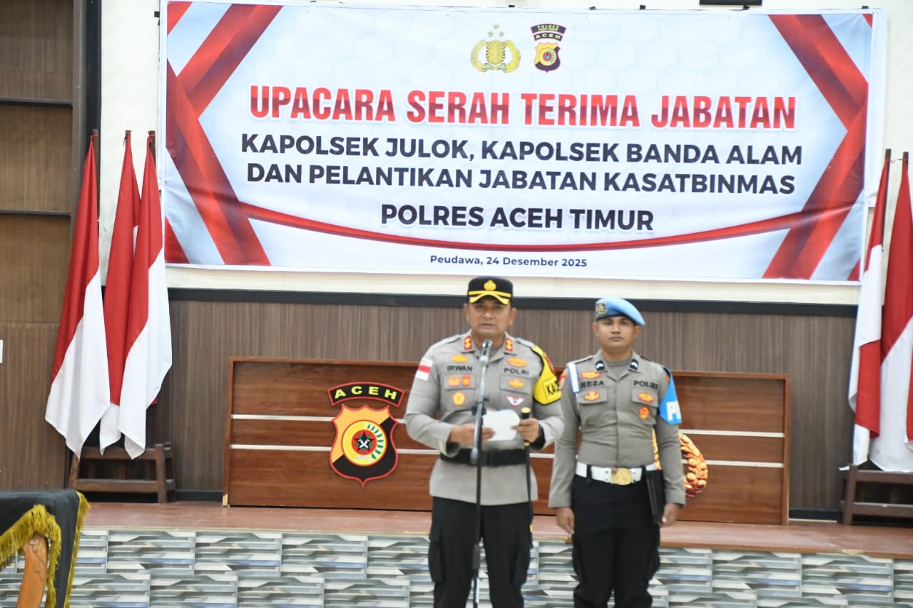 Transparancy Aceh Timur – Kapolres Aceh Timur AKBP Irwan Kuniadi, S.I.K. memimpin upacara Serah Terima Jabatan (Sertijab) Kapolsek Julok, Kapolsek Banda Alam, serta Pelantikan Kasat Binmas Polres Aceh Timur. Upacara berlangsung khidmat di Aula Bhara Daksa Mapolres Aceh Timur pada Rabu, (24/12/2025) pagi.