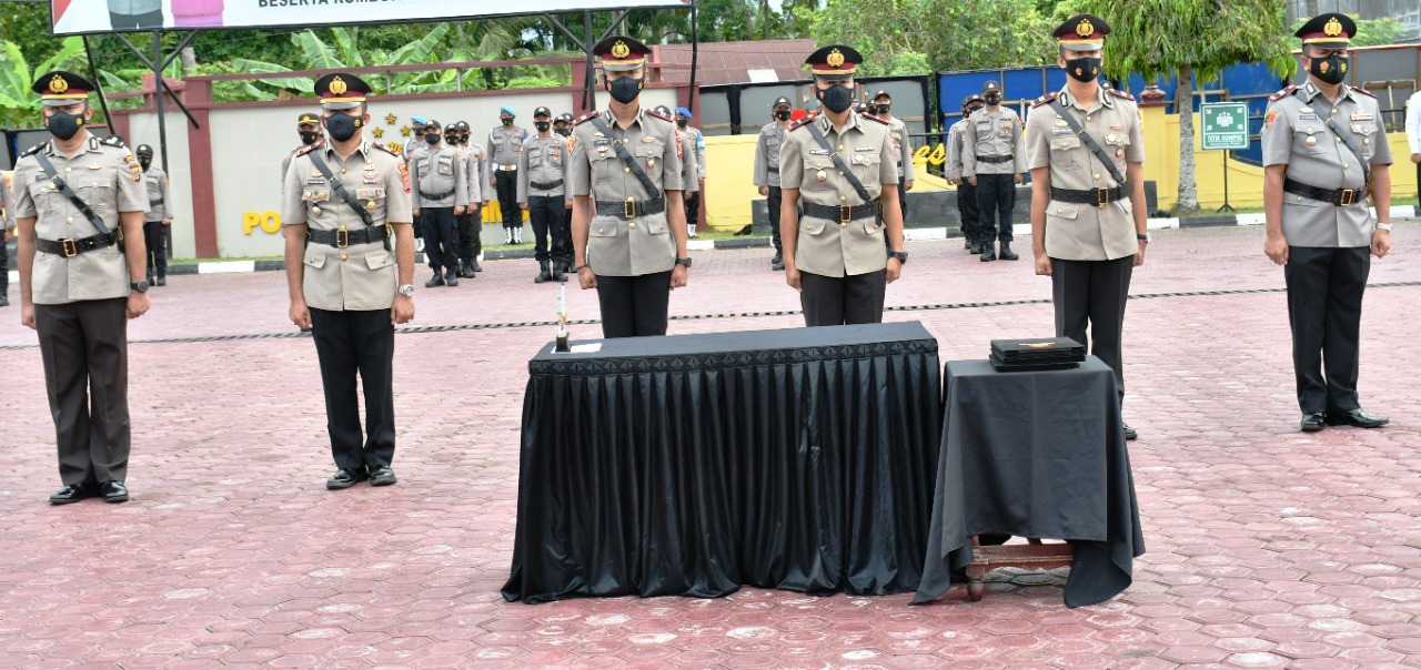 MEDIA TRANSPARANCY ACEH TIMUR-Bertempat di Lapangan Sarja Arya Racana, Polres Aceh Timur menggelar Upacara Pelantikan dan Serah Terima Jabatan (Sertijab) Kasat Reskrim, Kapolsek Ranto Peureulak dan Kapolsek Madat, Senin, (27/09/2021).