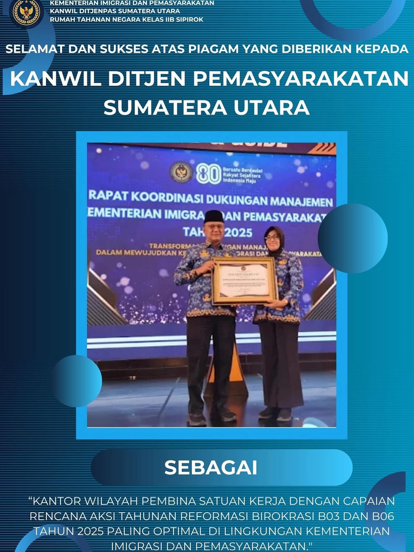 Kantor Wilayah Pembina Satuan Kerja dengan Capaian Rencana Aksi Tahunan Reformasi Birokrasi B03 dan B06 Tahun 2025 Paling Optimal di lingkungan Kementerian Imigrasi dan Pemasyarakatan.