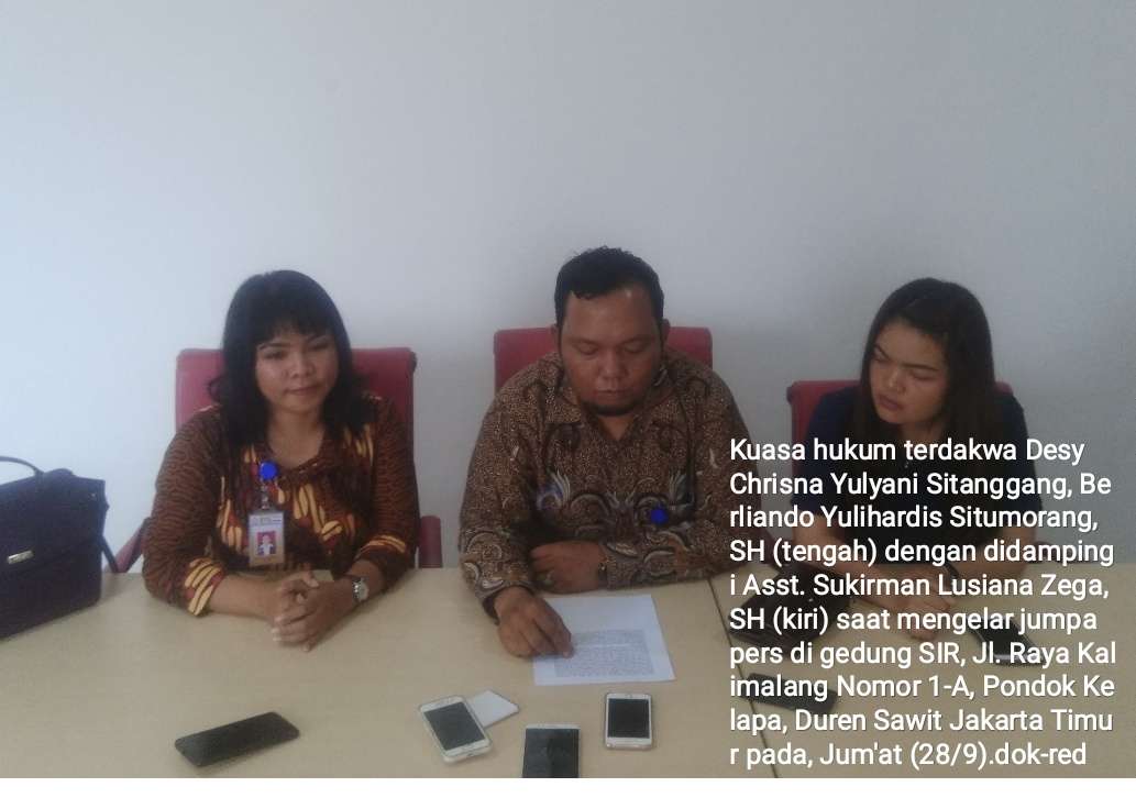 Berliando Yulihardis Situmorang, SH (tengah) didampingi Asst. Sumirna Lusiana Zega, SH (kiri) dan rekannya dari kantor pengacara BYS & Partners selaku Kuasa Hukum dari terdakwa, Desy Chrisna Yulyani Sitanggang ‘owner’ Arisol “Mama Yona”, saat memberikan keterangan pers dikantornya gedung Graha SIR (Standar Indonesian Rubber), jalan Raya Kalimalang Nomor 1-A, Pondok Kelapa, Duren Sawit Jakarta Timur, Jum’at (28/9).dok-istimewa