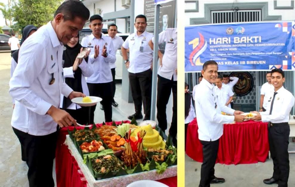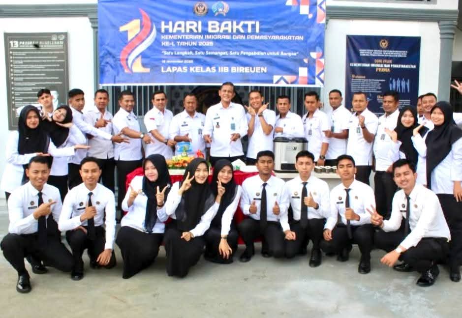 BIREUEN TRANSPARANSI – Lembaga Pemasyarakatan (Lapas) Kelas IIB Bireuen menggelar kegiatan tasyakuran dalam rangka memperingati Hari Bakti Kementerian Imigrasi dan Pemasyarakatan Ke 1 Tahun 2025. Peringatan ini diawali dengan pelaksanaan upacara secara virtual yang dipimpin langsung oleh Menteri Imigrasi dan Pemasyarakatan diikuti oleh seluruh jajaran pegawai di aula Lapas Bireuen, Rabu, 19 November 2025.