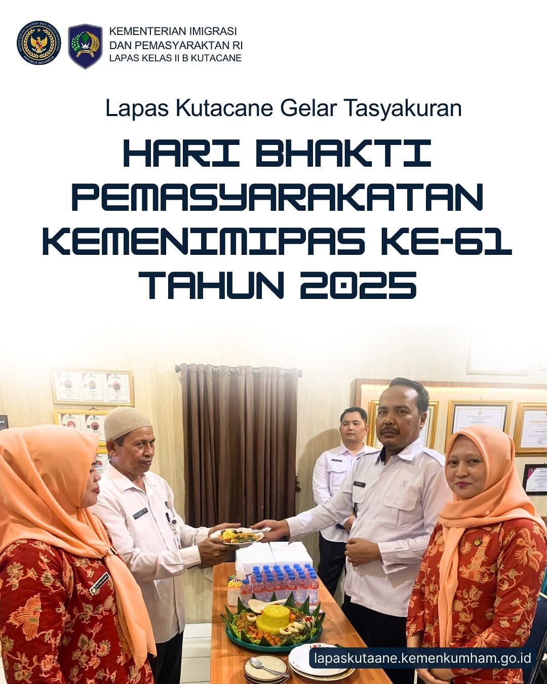 Melalui tema Hari Bhakti Pemasyarakatan ke-61 ini, yaitu “Pemasyarakatan PASTI Bermanfaat Untuk Masyarakat”, kita menegaskan komitmen untuk terus memperkuat integritas, profesionalisme, akuntabilitas, dan pelayanan prima dalam mewujudkan pemasyarakatan yang semakin berdampak positif bagi kehidupan berbangsa dan bernegara.