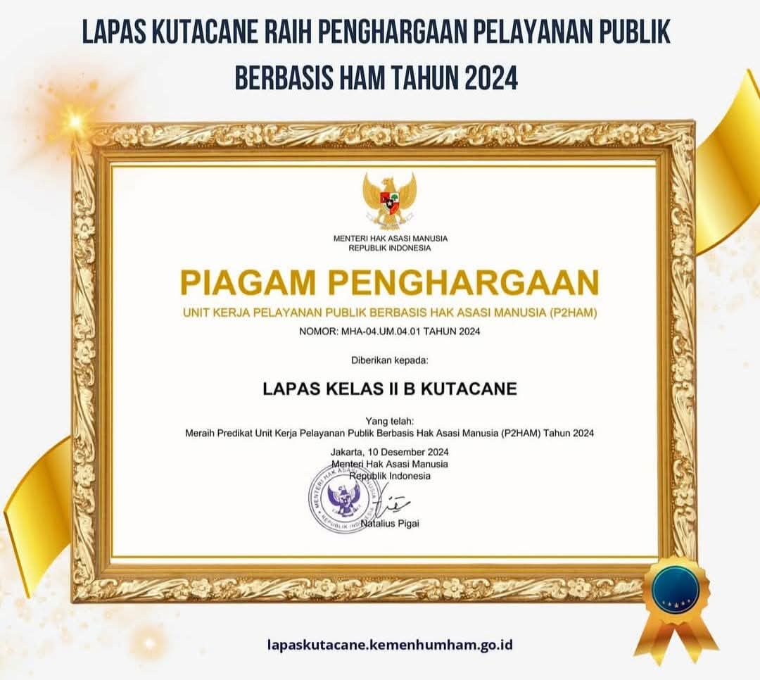 Penghargaan ini diberikan sebagai bentuk apresiasi kepada Lapas Kutacane dalam memberikan layanan publik yang memenuhi berbagai unsur HAM, baik kepada Warga Binaan maupun Masyarakat pengguna layanan.