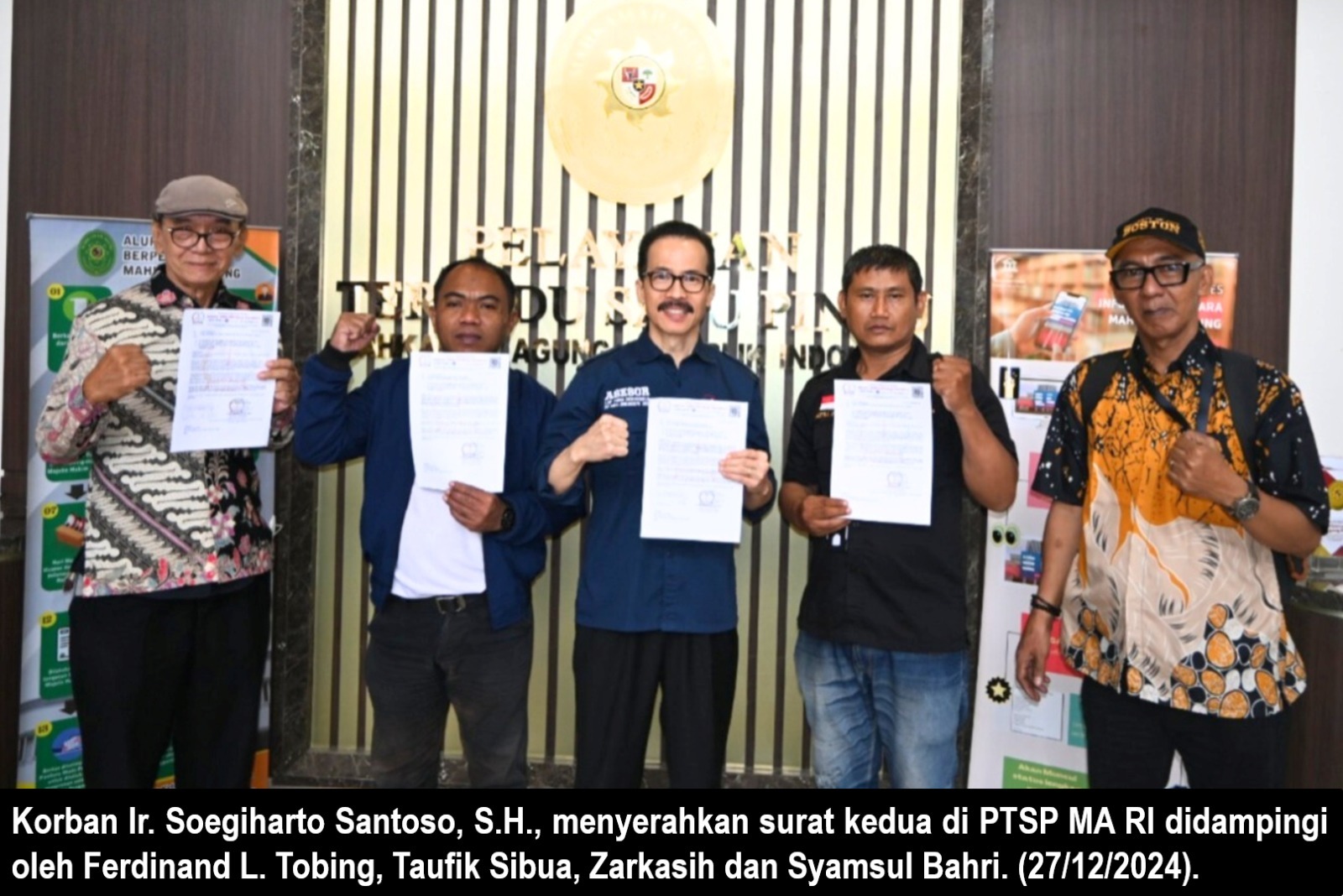 JAKARTA – mediatransparancy.com | Perjuangan mencari keadilan yang dilakukan Ir. Soegiharto Santoso, SH selaku Ketua Umum Assosiasi Pengusaha Komputer Indonesia (APKOMINDO) rupanya belum juga surut. Menyusul surat pertama yang dilayangkannya kepada Ketua Mahkamah Agung (MA) RI, Prof. Dr. H. Sunarto, SH., MH., dan kepada Juru Bicara Mahkamah Agung RI, Dr. Yanto, SH., MH., serta kepada Kepala Biro Hukum dan Humas Mahkamah Agung RI, Dr. Sobandi, SH., MH. pada tanggal 9 Desember 2024, surat kedua pun kembali dilayangkan kepada pejabat yang sama di Pusat PTSP Gedung MA terletak di Jalan Medan Merdeka Utara Nomor 9-13, Gambir Kecamatan Gambir, Jakarta Pusat pada, Jum’at (27/12/2024).