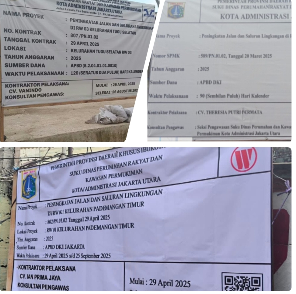 Seperti yang sudah diberitakan berulangkali, beberapa kegiatan Sudin PRKP Jakut yang dikerjakan tidak sesuai ketentuan adalah Peningkatan Jalan dan Saluran Lingkungan di RW 001 Kelurahan Pademangan Timur dengan Nomor Kontrak: 802/PN.01.02 Tanggal 29 April 2025 yang dilaksanakan Pelaksana: CV Ian Prima Jaya yang ditenggarai terjadi banyak pelanggaran.