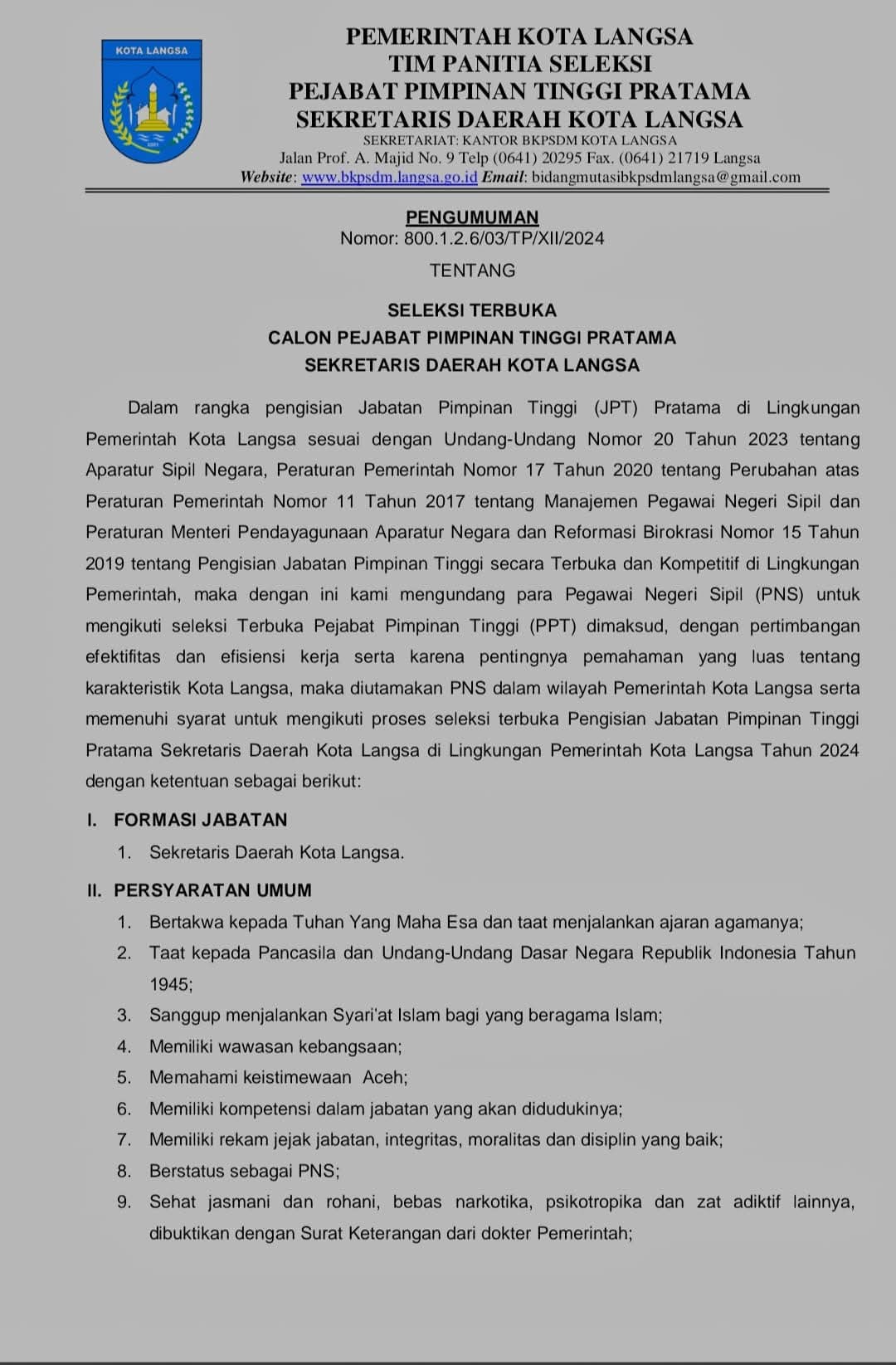 KOTA LANGSA, mediatransparancy.com – Paska dibukanya Pendaftaran Seleksi terbuka calon Pejabat Pimpinan Tinggi (PPT) Pratama untuk jabatan Sekretaris Daerah (Sekda) yang telah diumumkan Pemko Langsa melalui Panitia Seleksi (Pansel) JPT Pratama ini mulai dibuka tanggal 02 – 16 Desember 2024.