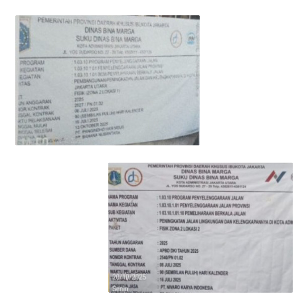 1. Peningkatan Jalan Lingkungan dan Kelengkapannya di Kota Adm Jakarta Utara Fisik Zona 2 Lokasi 2 yg dikerjakan oleh PT. Nivaro Karya Indonesia dengan anggaran sebesar Rp 2,5 miliar yang bersumber dari APBD Prov DKI Jakarta tahun 2025.