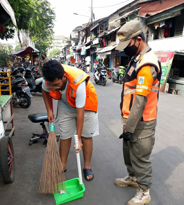 “Semua pelanggar langsung diberikan sanksi untuk membersihkan sampah di secara bergantian selama 60 menit. Mereka dikenakan rompi pelanggar Pembatasan Sosial Berskala Besar (PSBB). Para pelanggar menjawab berbagai banyak alasan saat ditanya kenapa tidak pakai Masker, yang jelas pelanggar diberikan sanksi sosial” kata Tajudin, 11/6/2021.
