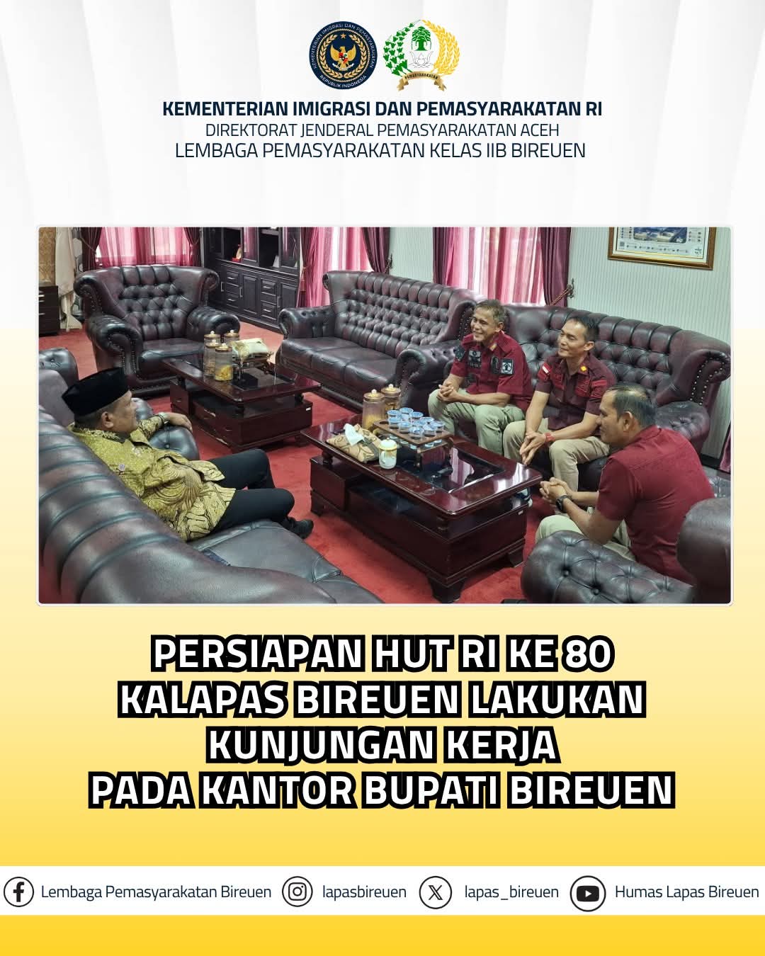 Kegiatan kunjungan kerja ini merupakan bentuk sinergi positif antara Lapas Kelas IIB Bireuen dan Pemerintah Daerah guna mewujudkan sistem Pemasyarakatan yang lebih baik.