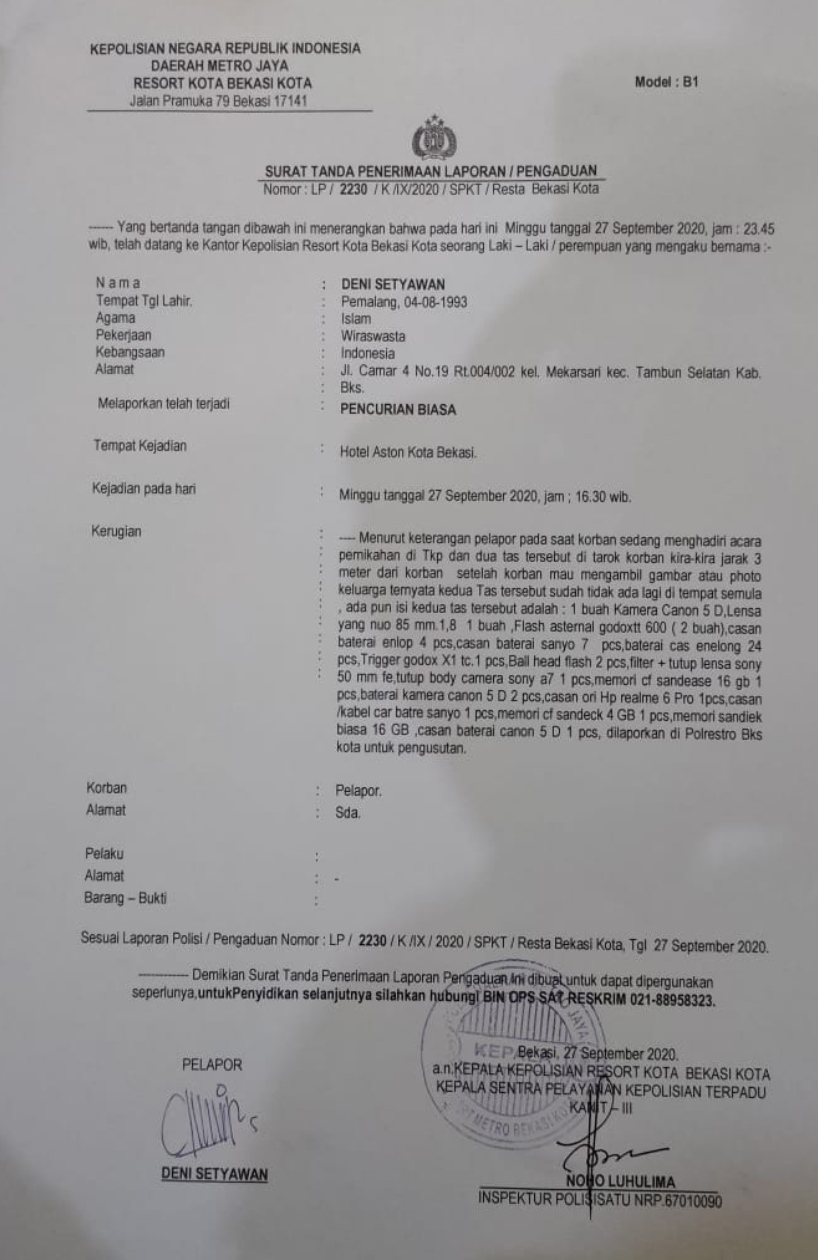 Kasus pidana pencurian ini pun telah dilaporkan di Polres Metro Bekasi Kota, dengan bukti Laporan Polisi (LP) Nomor : LP/2230/K/IX/2020/SPKT/Resta Bekasi Kota.[]red