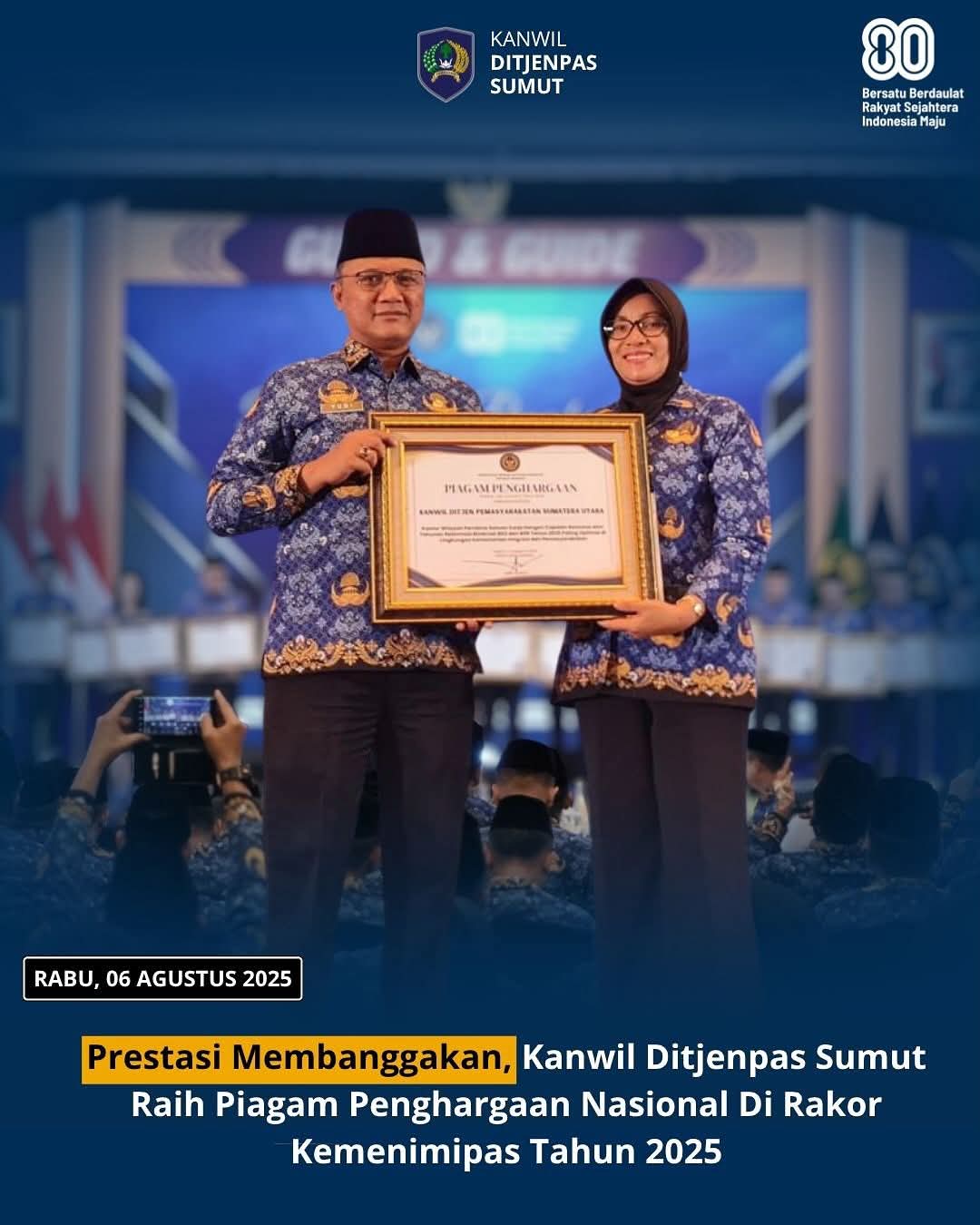 Penghargaan bergengsi tersebut diterima langsung oleh Kepala Kantor Wilayah Ditjenpas Sumut, Yudi Suseno, yang turut didampingi oleh Kepala Bagian Tata Usaha dan Umum, Endang Sriwati, dalam acara yang diselenggarakan di Jakarta pada Rabu, 6 Agustus 2025.