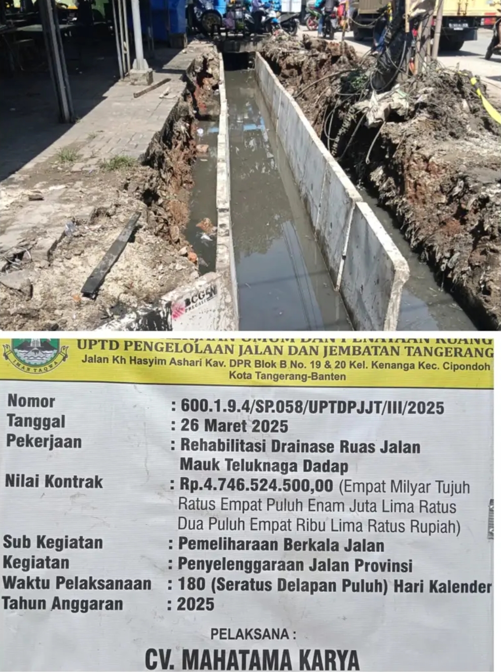 *. Proyek Rehabilitasi Drainase Ruas Jalan Mauk Teluknaga Dadap dengan anggaran sebesar Rp 4.746.524.500 yang dikerjakan oleh CV Mahatama Karya.