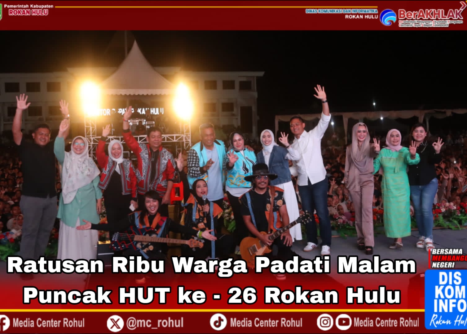 – Malam puncak perayaan Hari Ulang Tahun (HUT) Kabupaten Rokan Hulu (Rohul) ke- 26 berlangsung megah dan penuh semarak. Ratusan ribu masyarakat tumpah ruah di Lapangan Kantor Bupati, menikmati hiburan dari artis Minang kenamaan Rayola serta penampilan memukau dari grup band nasional Kotak yang mengguncang panggung pesta rakyat, Sabtu malam (25/10/2025).