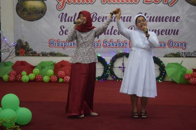 Ratusan undangan dan peserta Natal Bersama Oikumene 2019 sontak langsung diam dan terpukau dengan lagu yang dilantunkan oleh gadis muslim Restu Widya, yang berduet dengan Suster M. Inosensia FSGM.