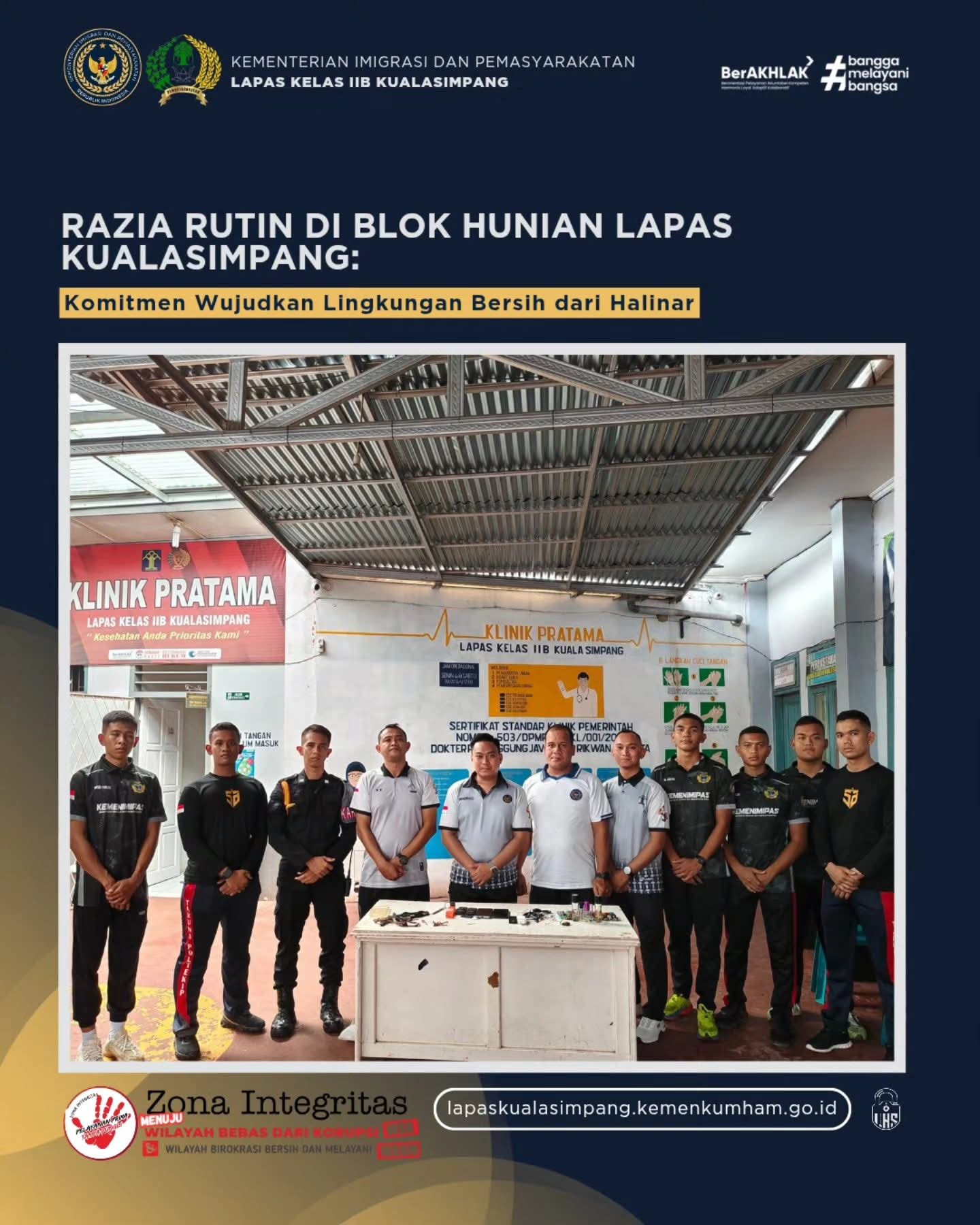 Kegiatan ini merupakan wujud komitmen jajaran pengamanan dalam upaya pemberantasan peredaran dan pengendalian Halinar (Handphone, Pungutan Liar dan Narkotika) di dalam Lapas Kuala Simpang.