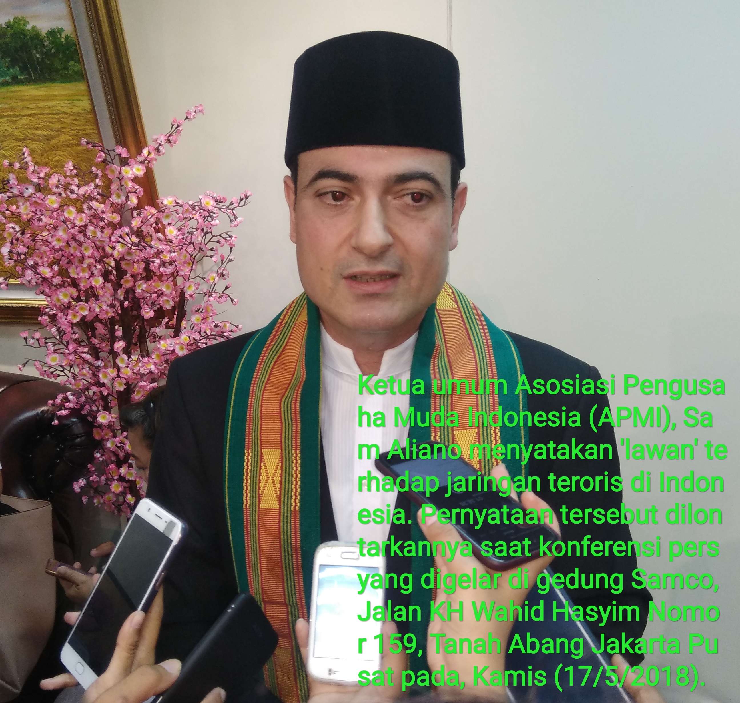 JAKARTA, MEDIATRANSPARANCY.COM – Sam Aliano, pengusaha yang mendeklarasikan diri sebagai Presiden RI 2019 sekaligus selaku Ketua umum Asosiasi Pengusaha Muda Indonesia (APMI) menyatakan ‘perlawanan’ terhadap jaringan teroris di Indonesia. Pernyataan tersebut dilontarkannya saat konferensi pers yang digelar di gedung Samco, Jalan KH Wahid Hasyim Nomor 159, Tanah Abang Jakarta Pusat pada, Kamis (17/5/2018).