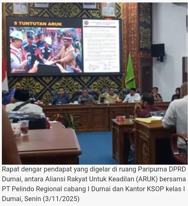– Rapat dengar pendapat yang digelar di ruang Paripurna DPRD Dumai, antara Aliansi Rakyat Untuk Keadilan (ARUK) bersama PT Pelindo Regional cabang I Dumai dan Kantor KSOP kelas I Dumai, Senin (3/11/2025) kemarin yang awalnya berjalan santai namun tiba-tiba berubah memanas. 04/11/25.