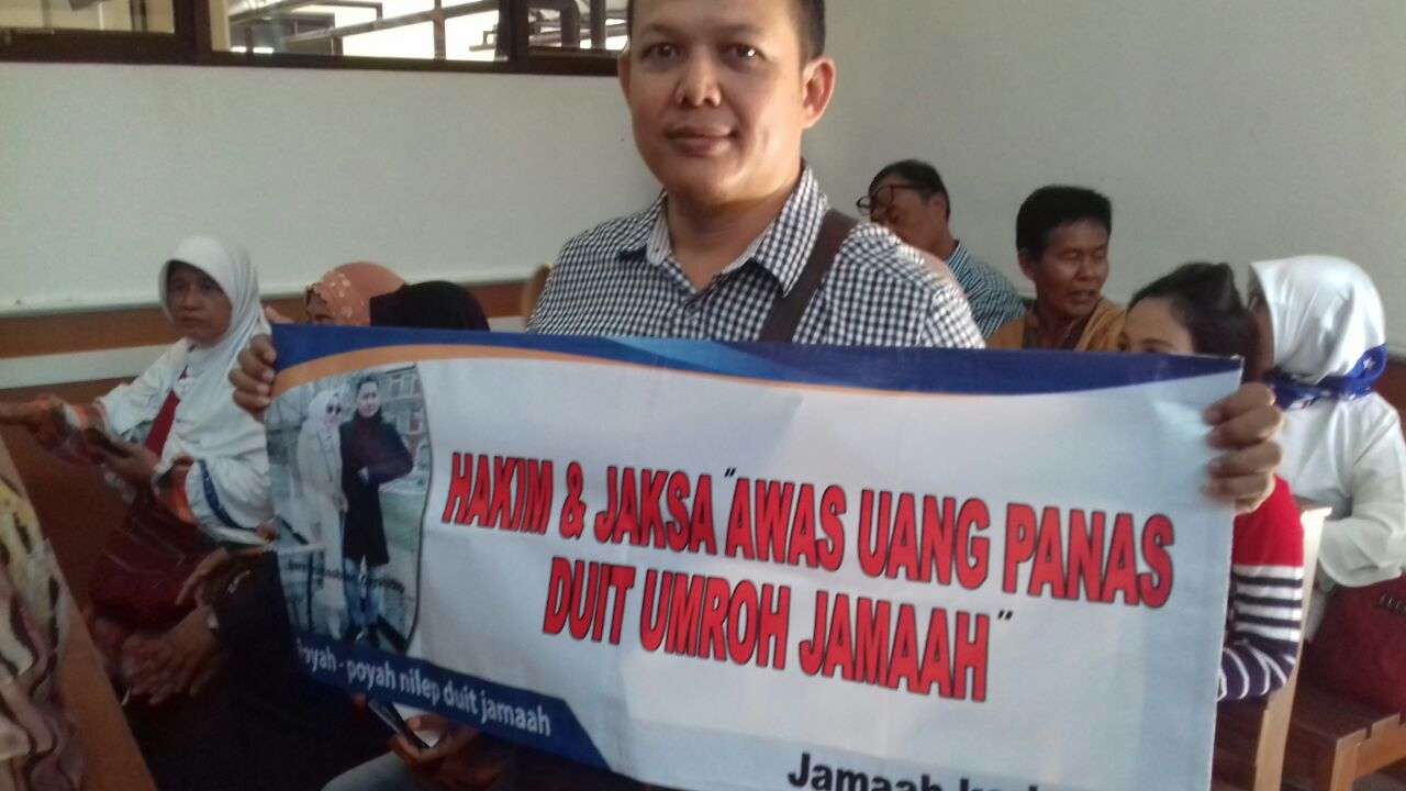 Dalam semangat yang membara dan penuh harapan keadilan di sidang PERTAMA ini, para korban calon jemaah umroh bersatu dari berbagai wilayah termasuk Kota Bekasi hingga Kalimantan Timur dengan membentangkan berbagai spanduk. Dalam persidangan kali ini dipimpin oleh Ketua Majelis Hakim Soebandi, SH,MH yang dimulai pada pukul 10.00 WIB dengan pengawalan puluhan anggota kepolisian dan berjalan kondusif.
