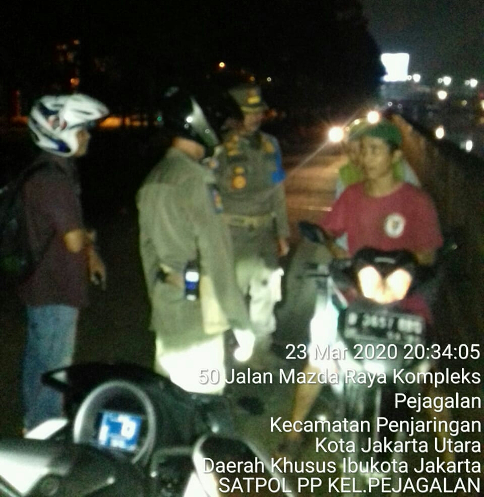 JAKARTA, MEDIA TRANSPARANCY – Satpol PP Kelurahan Pejagalan menertibkan para pasangan yang ‘mojok’ (berduaan) di sepanjang Jalan Inspeksi Taman Hutan Kota Penjaringan, Jakarta Utara, Senin (23/3/2020) malam, pukul 20.00 WIB.