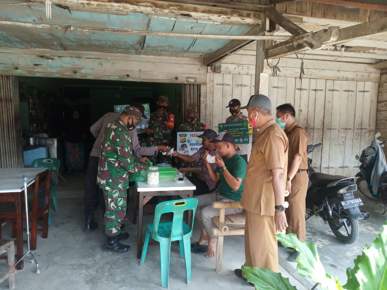 bersama anggota Polsek, pukesmas dan PNS muspika Kecamatan Banda alam Kabupaten Aceh Timur, terus melakukan sosialisasi tentang protokol kesehatan pencegahan penyebaran virus corona kepada masyarakat di sekitar wilayah Kecamatan Banda alam.