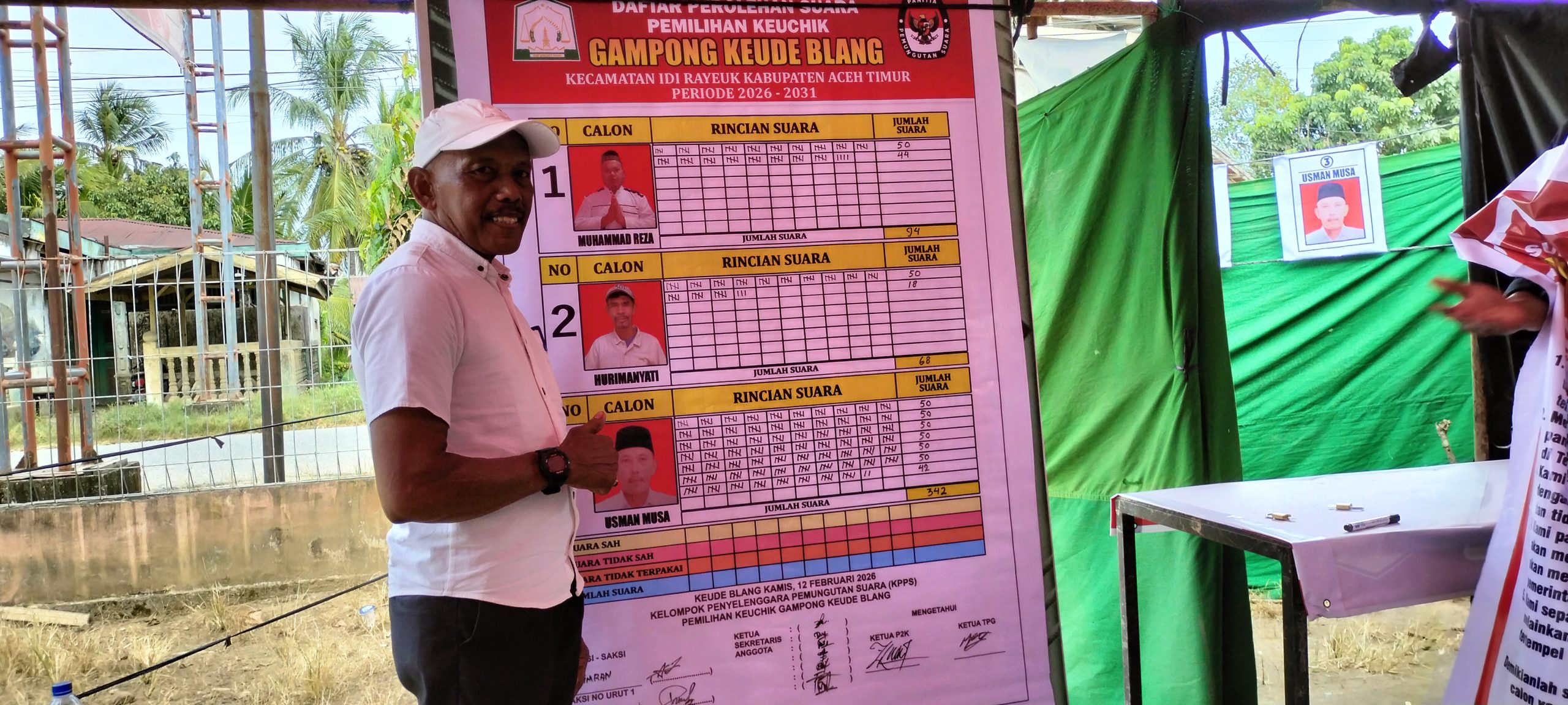 Berdasarkan hasil rekapitulasi akhir dari seluruh Tempat Pemungutan Suara (TPS), Calon Keuchik Nomor Urut 03 usman musa yang terpilih sebagai Keuchik Desa Keude Blang untuk periode 2026–2032 setelah unggul atas para pesaingnya.