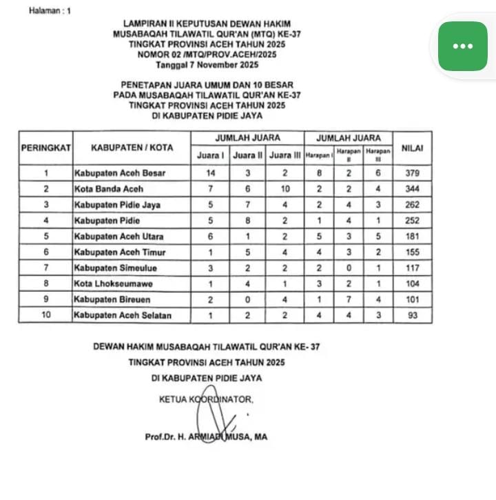 Keputusan resmi ini ditandatangani oleh Ketua Koordinator Dewan Hakim MTQ Aceh ke-37, Prof. Dr. H. Armia Idris, MA, dan menjadi dasar penetapan juara umum. MTQ tahun ini bukan hanya menjadi ajang kompetisi, tetapi juga momentum memperkuat semangat syiar Al-Qur’an di seluruh Aceh, serta mempererat ukhuwah Islamiyah antar-kafilah dari 23 kabupaten/kota se-Aceh.