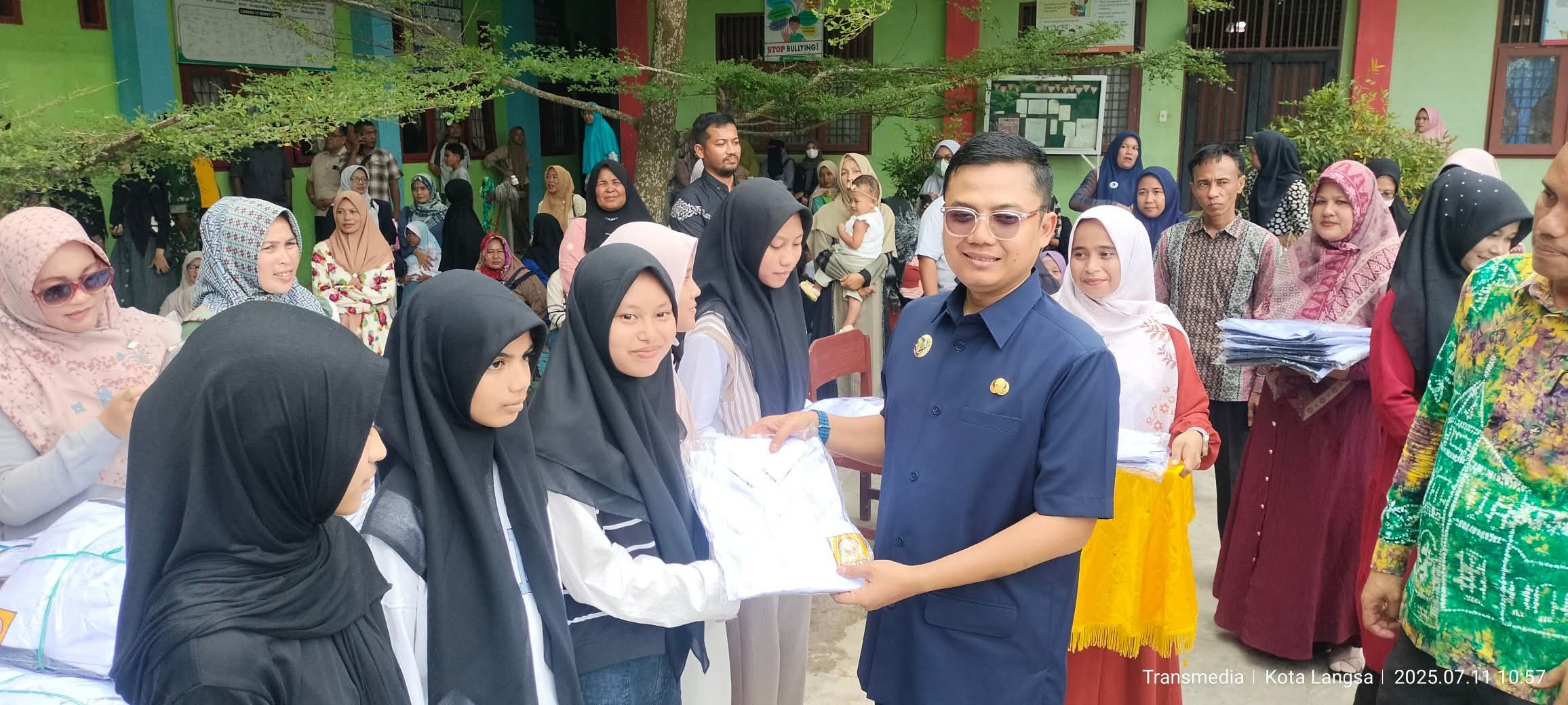 Walikota Langsa, Jeffry Sentana S. Putra SE. Saat Membagikan Seragam Sekolah Secara Simbolis Kepada Peserta Didik SMP Negeri 3 Kota Langsa, Jum'at, 11 Juli 2025.
